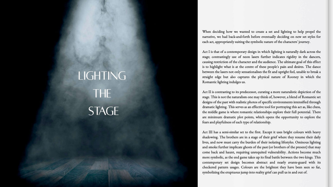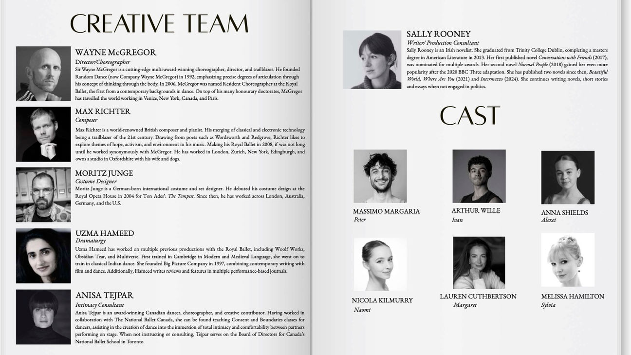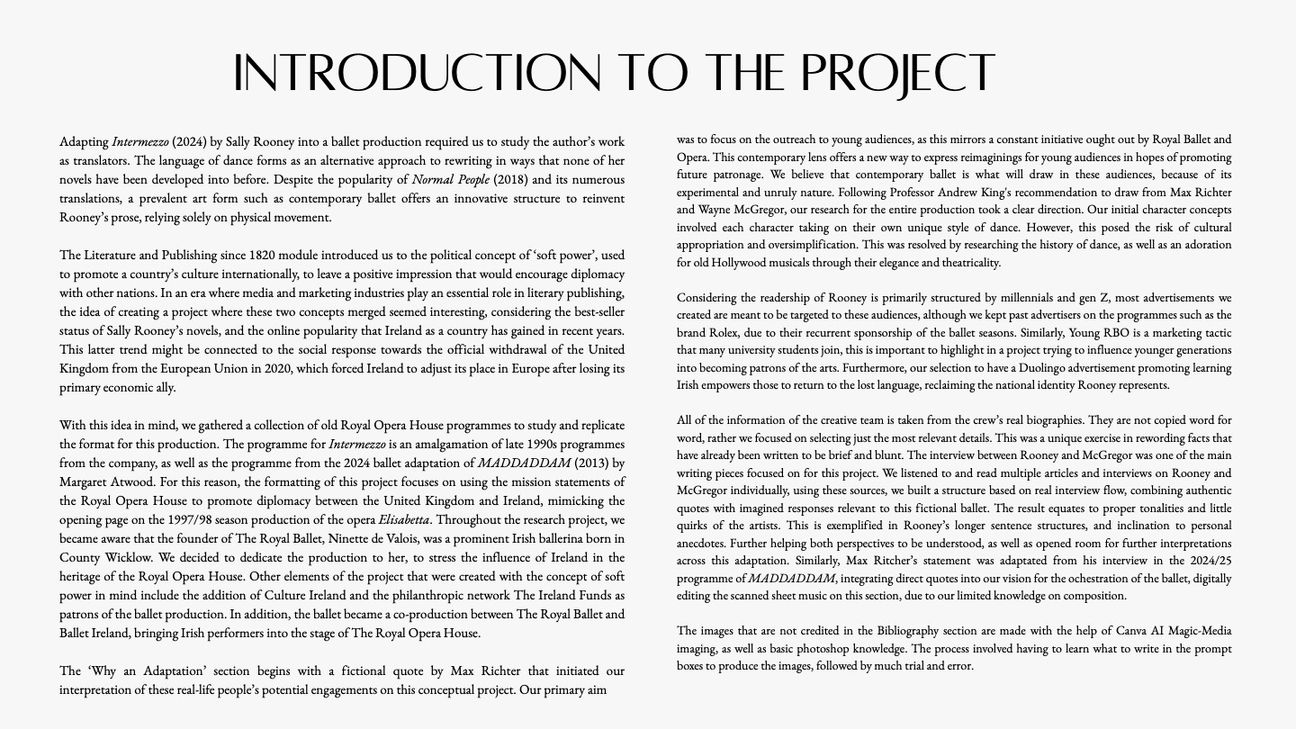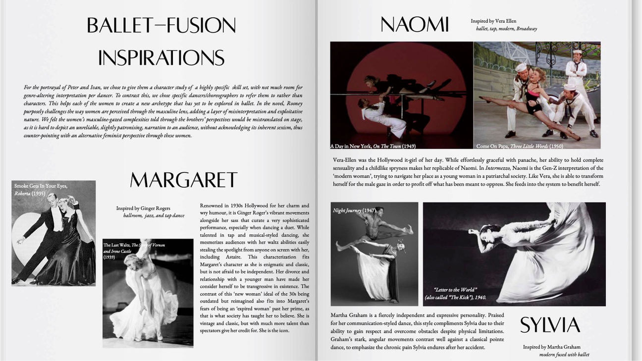 Adapting Intermezzo (2024) by Sally Rooney into a ballet production required us to study the author’s work as translators. The language of dance forms as an alternative approach to rewriting in ways that none of her novels have been developed into before. Despite the popularity of Normal People (2018) and its numerous translations, a prevalent art form such as contemporary ballet offers an innovative structure to reinvent Rooney’s prose, relying solely on physical movement.