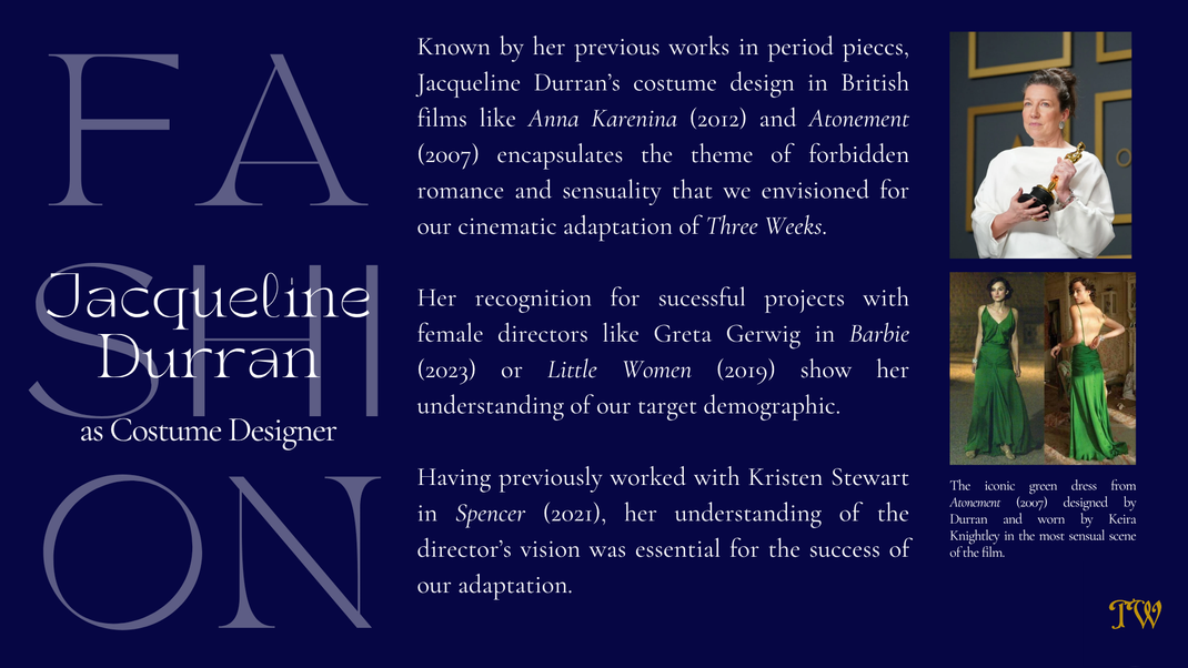 After the cinematic adaptation of Poor Things by Alasdair Gray, and the commercial success of Barbie (2023) by Greta Gerwig, we believe that a film adaptation of Elinor Glyn’s Three Weeks (1907) resonates with the current fascination with female empowerment and independence that brings masses into the cinemas.